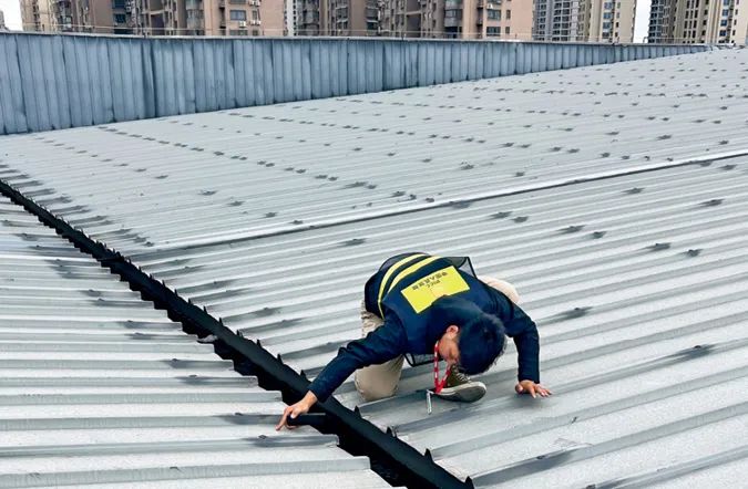 ▲“梅花”台风将至,2022年9月14日16时,人保财险浙江温州永嘉支公司青年员工赶在台风前走访重点企业组织防灾检查。他不惧危险,爬上客户厂房棚顶查看密封情况,只为确保厂房安全。